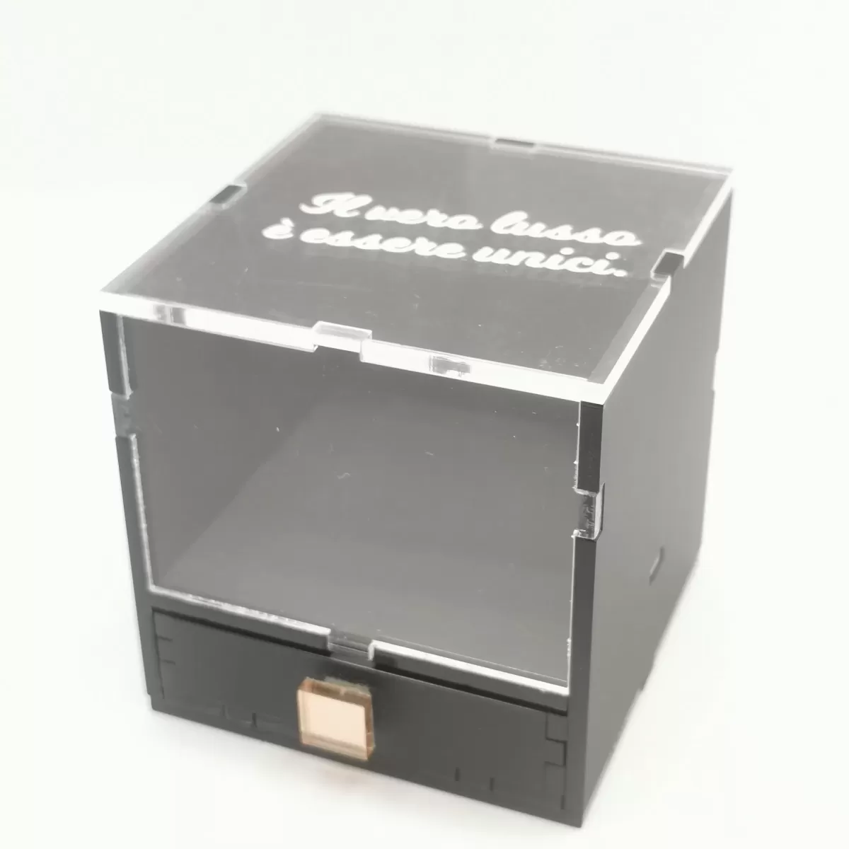 Interamente realizzata in plexiglass nero Soft-Touch e plexiglass trasparente, top in plexiglass trasparente, pomello in plexiglass specchio