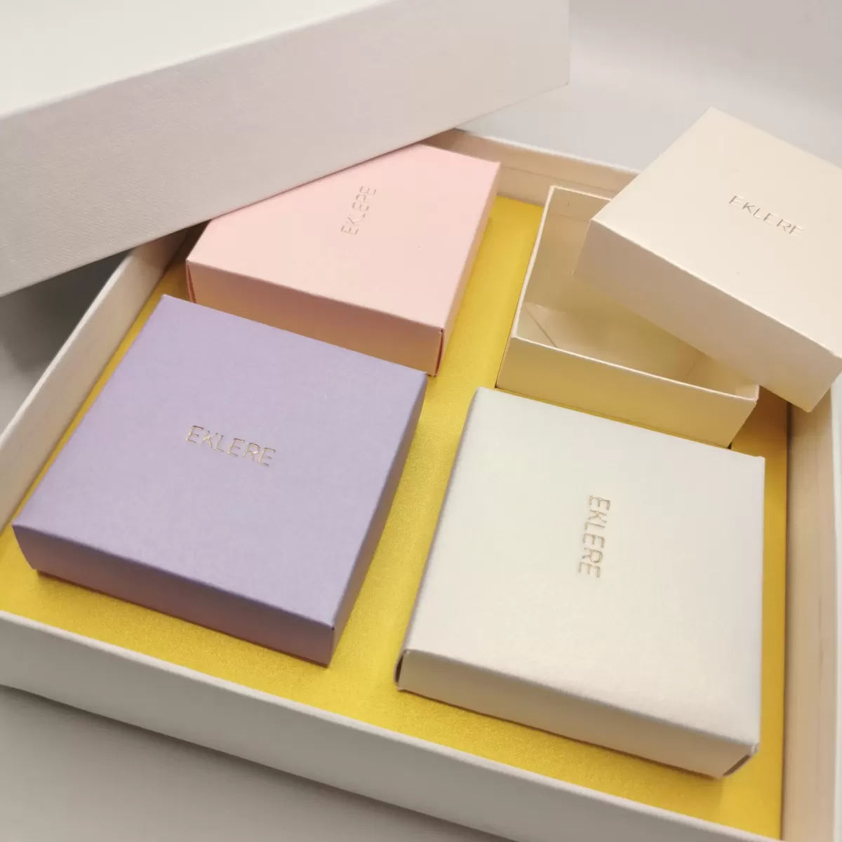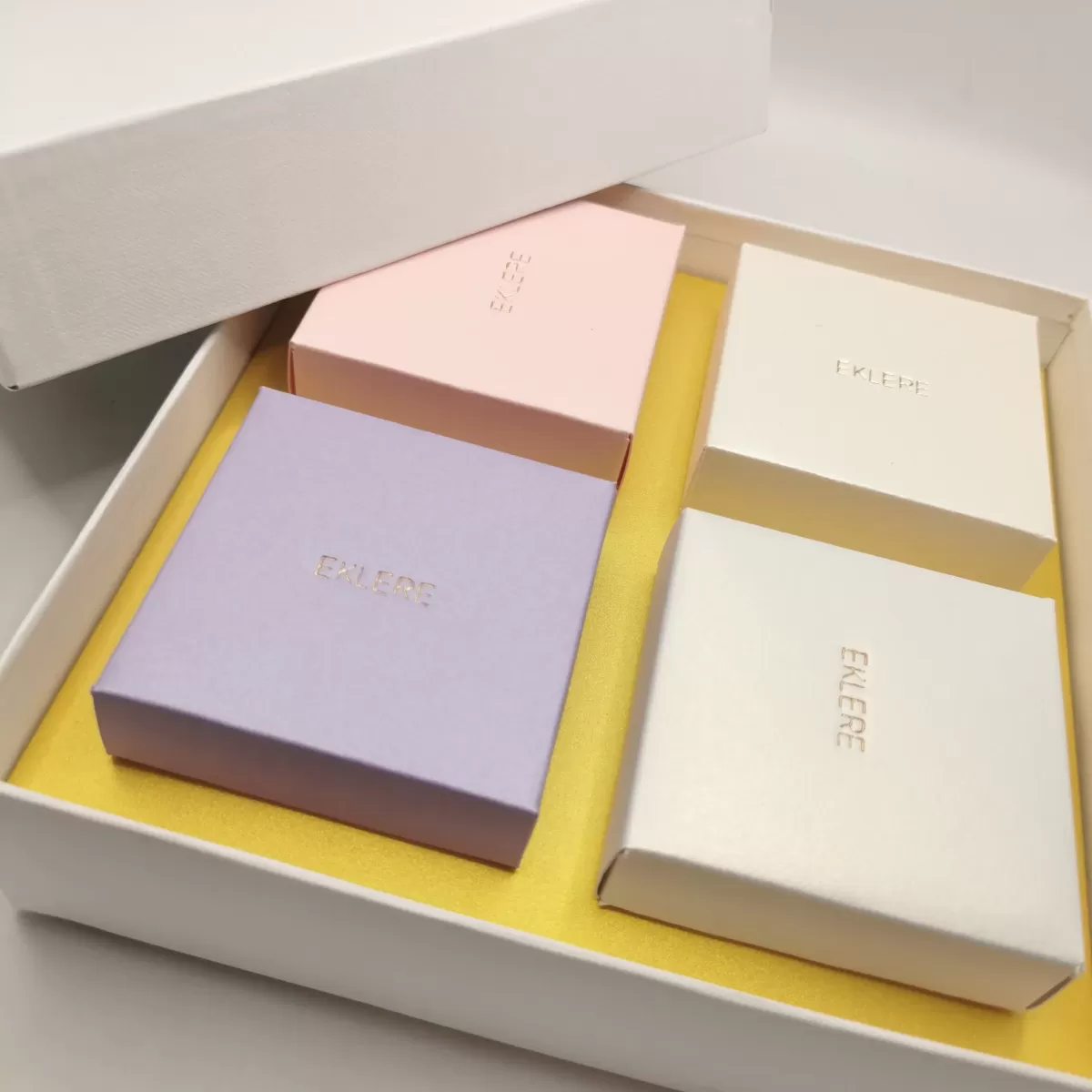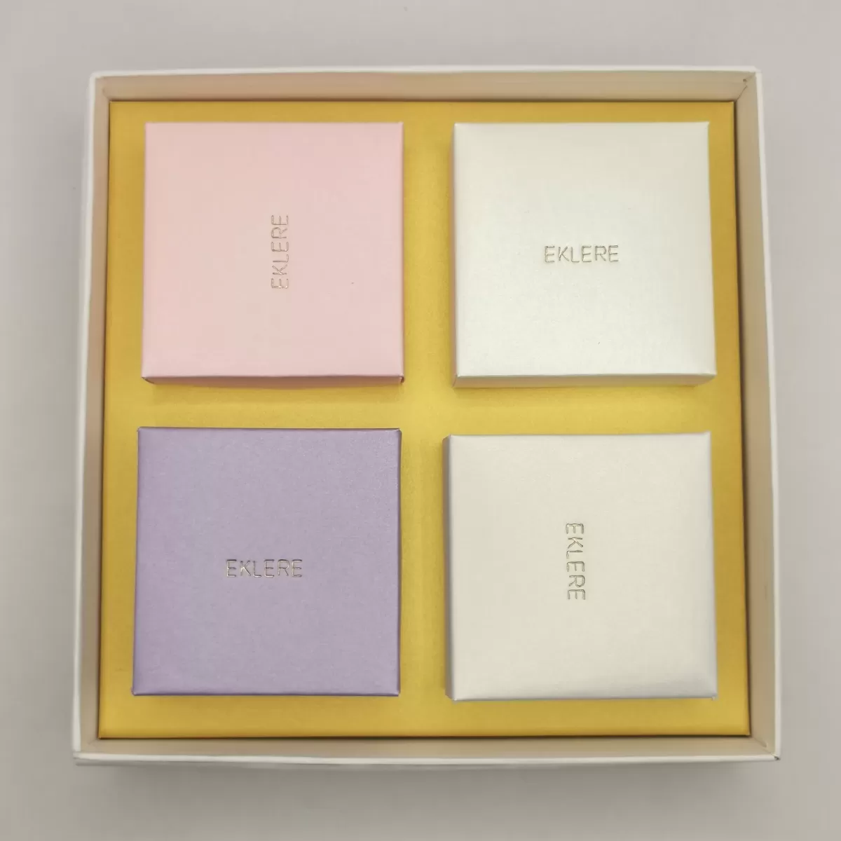 19644_2 = versione basic box: fondo e coperchio in cartoncino gc, alloggio in carta perlata, scatoline interne 65x65x50 mm circa realizzate in carta perlata