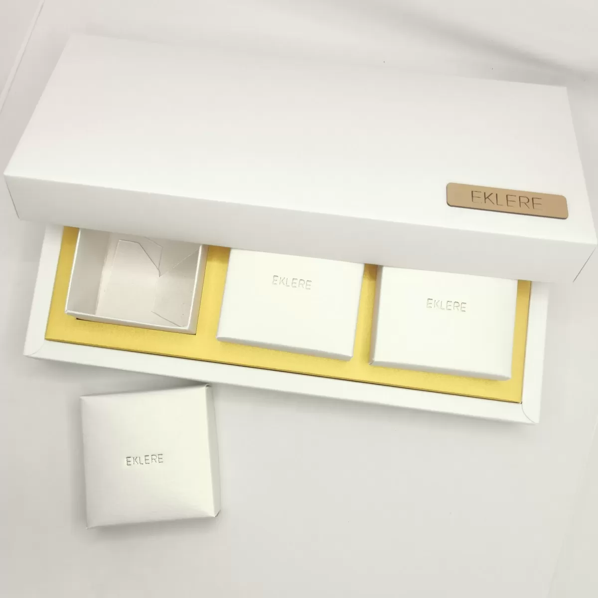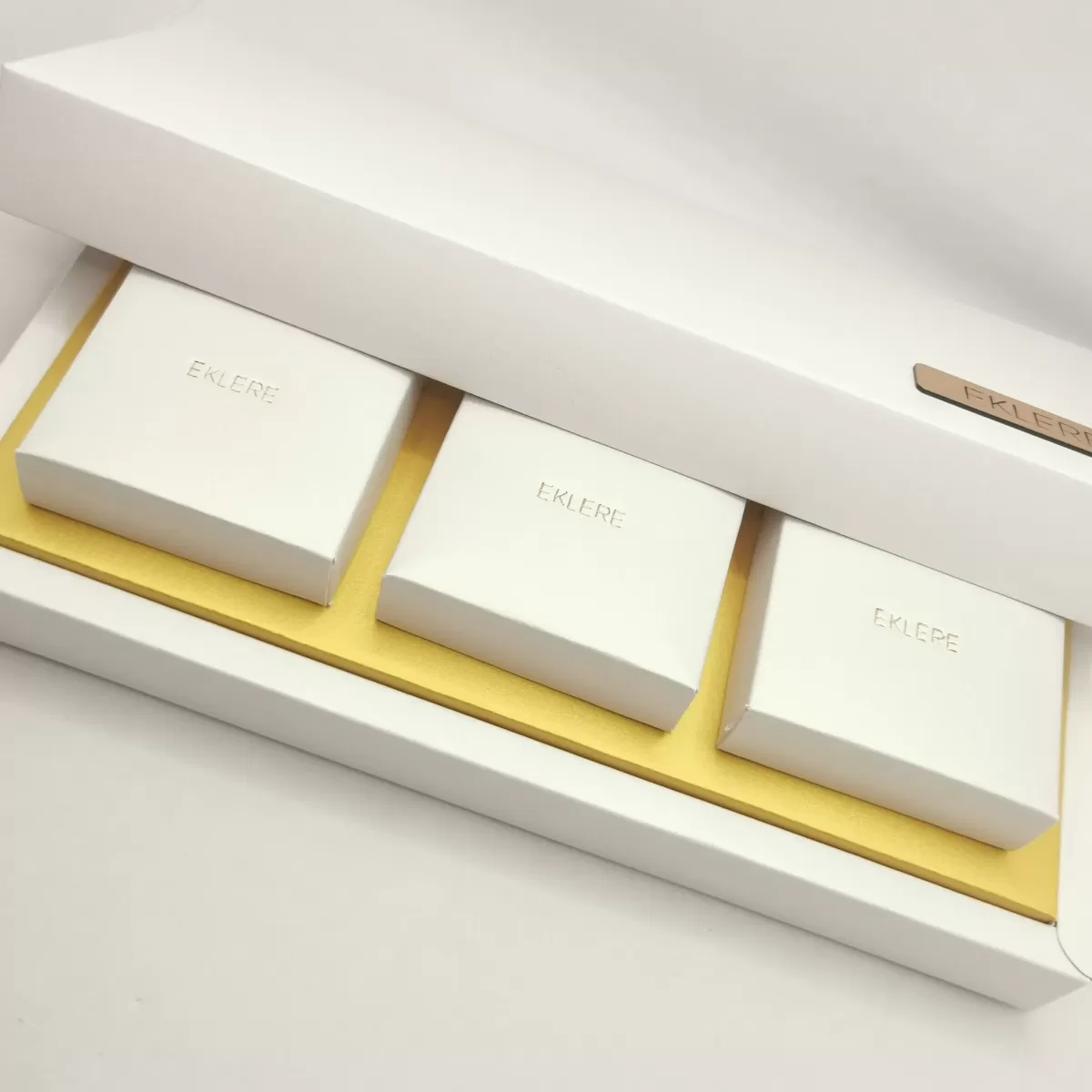 19645_2 = fondo e coperchio in cartoncino cream, alloggio in carta perlata, scatoline interne 65x65x50 mm circa in carta perlata